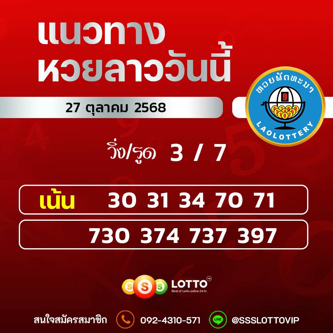 แนวทางหวยลาว วันนี้ 27/10/2568 หวยลาวพัฒนา ลาวสามัคคี เลขเด็ดสดๆ แจกฟรี เว็บนี้ไม่มีโกง เเทงหวย หวยออนไลน์ Ssslotto