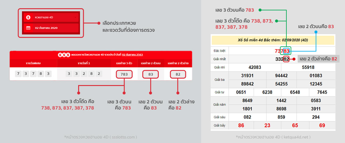 2 ตัวล่าง คือ เลขท้าย 2 ตัวของรางวัล Giai nhat เช่น เลข 82 ถ้าซื้อถูก จะได้รับรางวัลบาทละ 90 หรือ 1 : 90
